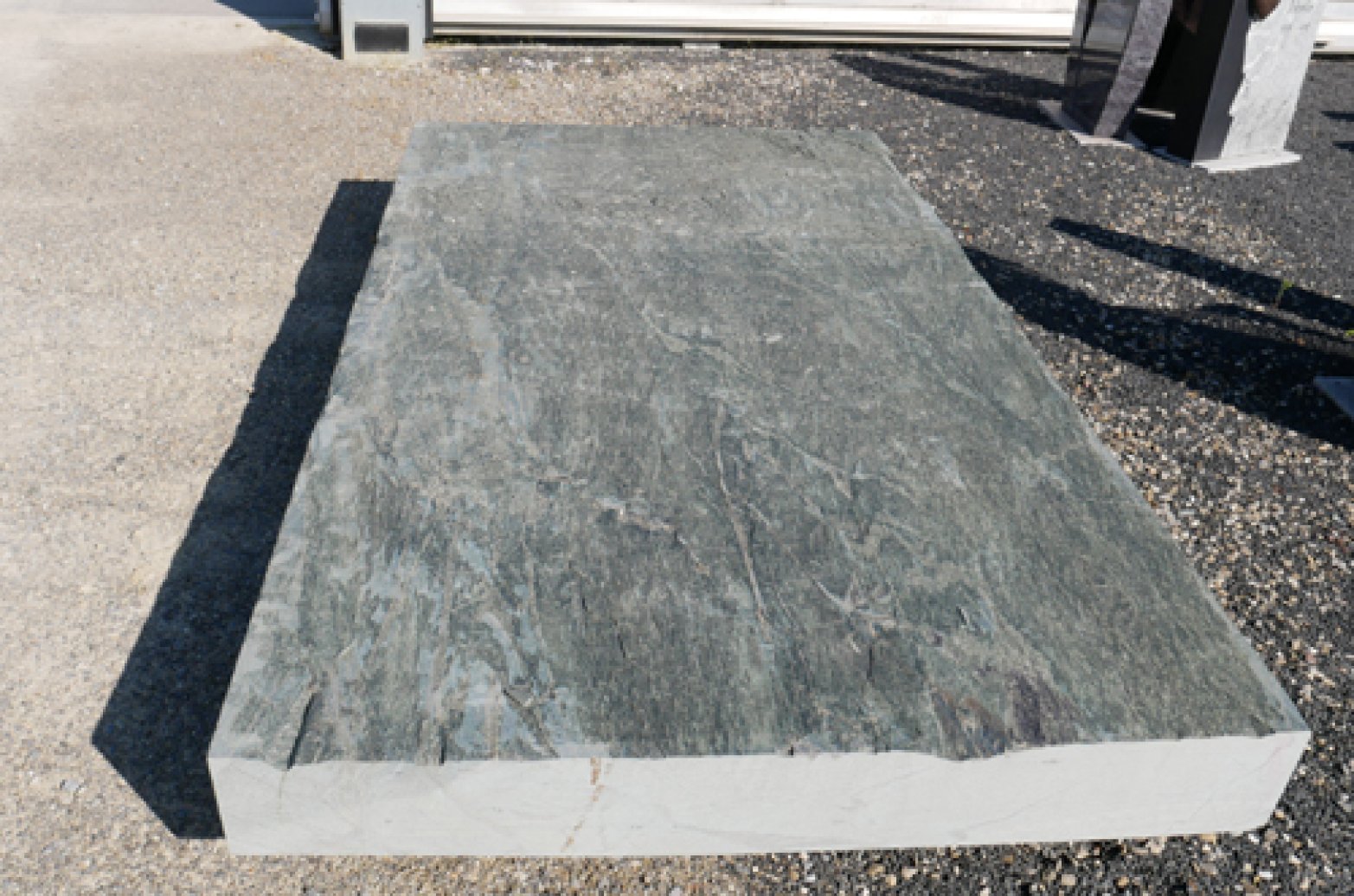 Serpentin-Tranche gespalten (oben geflammt, Unterseite gesägt)