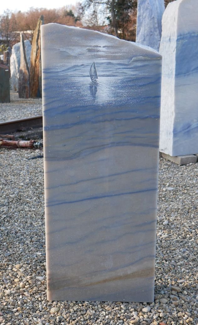 Azul-Quarzit-Stele, allseits poliert, (Kopf natur, Radierung mit Segelboot)